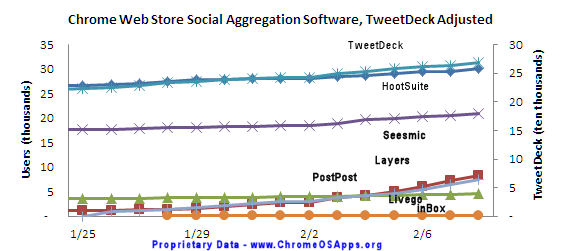 The above chart has moved TweetDeck to the Y2 axis and TweetDeck Users are now represented on a ten thousand scale.